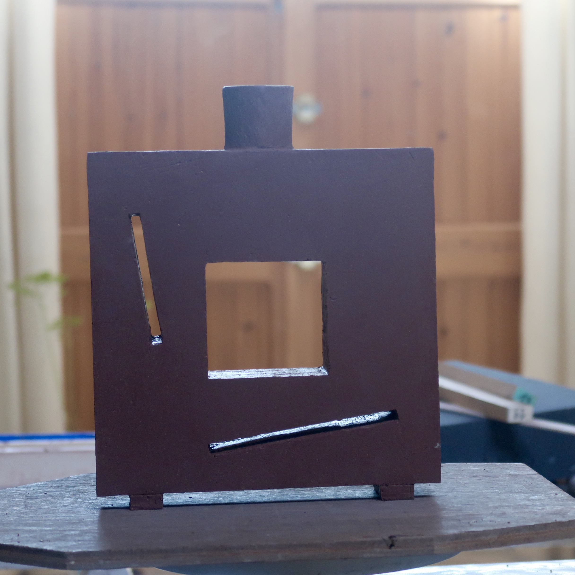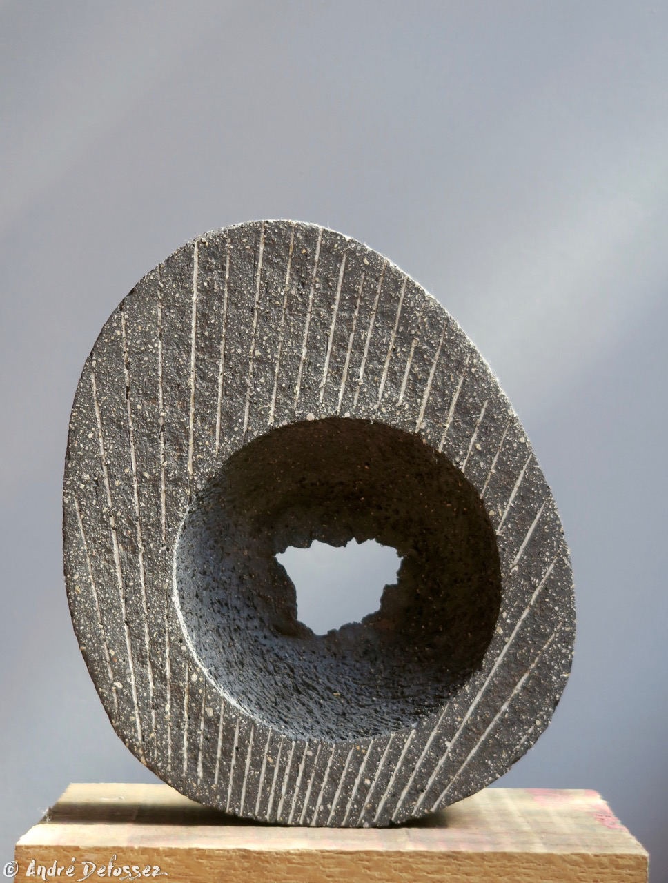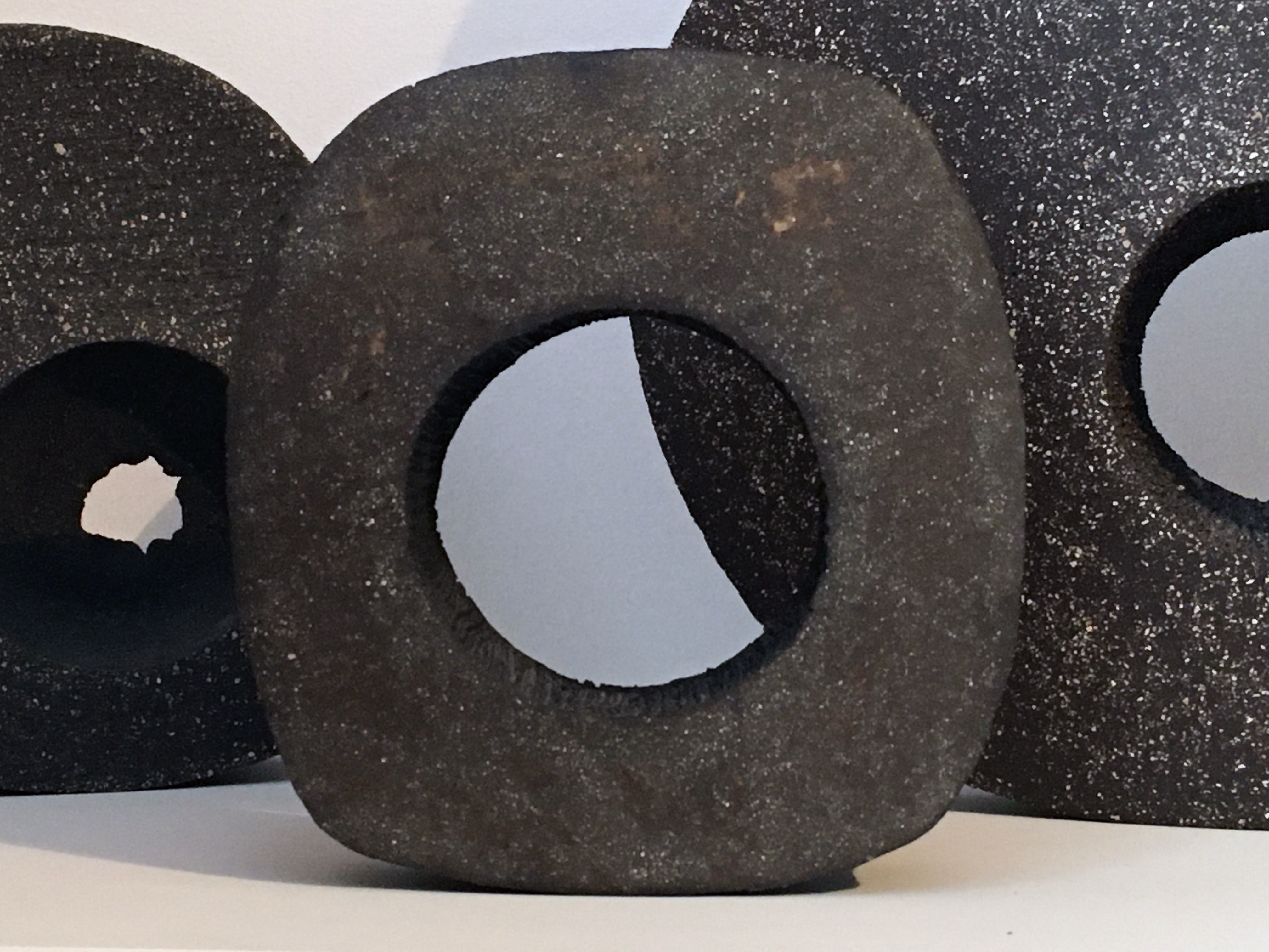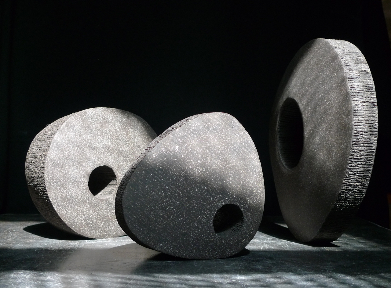 Après ces quelques pièces hors série, voici quelques-uns de mes ‘cyclopes‘, ainsi nommés car ils ont tous un ‘œil’ ou un ‘jour’ autour duquel se déploie un ciel étoilé : conçus dans une terre noire contenant des grains de chamotte blancs et montés à la plaque, les pièces ne sont pas émaillées, mais leur polissage permet de révéler les grains de chamotte comme si des galaxies émergeaient sans bruit de la nuit noire. Comme par ailleurs, les tranches restent très rugueuses, cela leur confère une dimension haptique très particulière qui enrichit la perception formelle de ces sculptures : leur toucher soyeux contraste avec le caractère très minéral de leur aspect visuel. Pour certains d’entre elles, les faces lisses ont été très finement engobées de porcelaine, comme si un léger voile nuageux masquait en partie la voûte céleste. Et l’une d’elles a reçu un émail blanc avant sa cuisson en mode ‘Raku’.