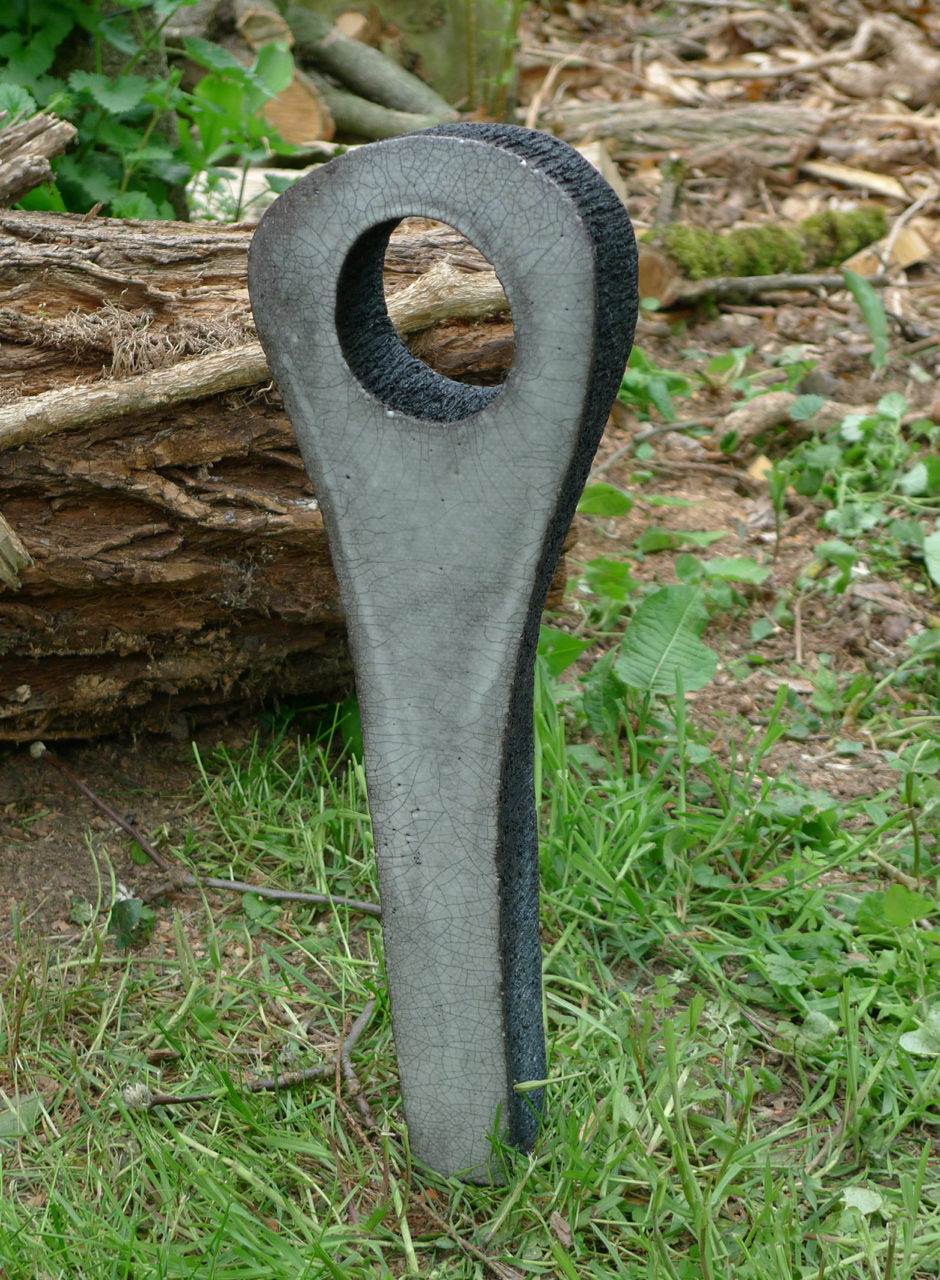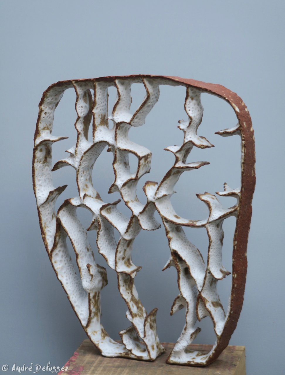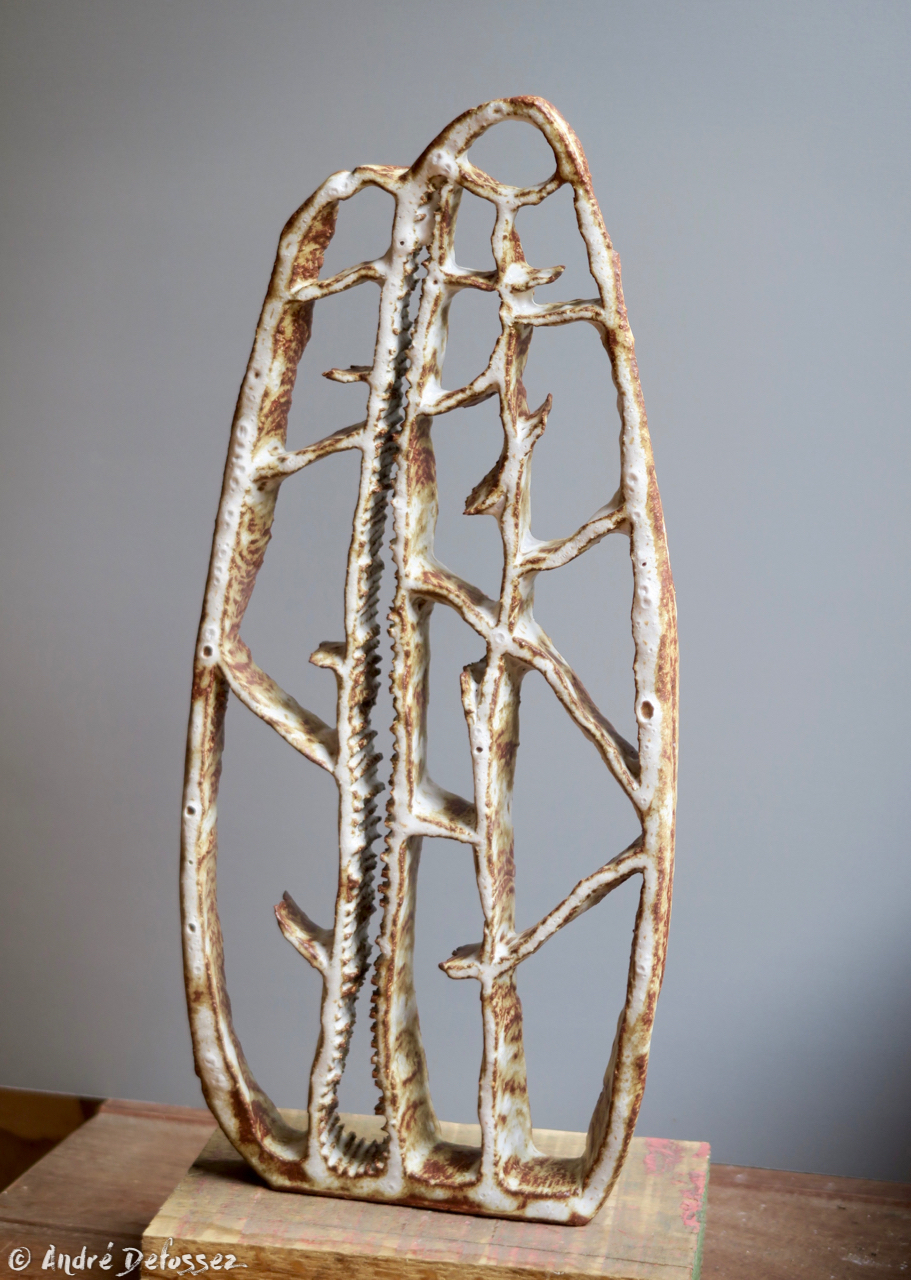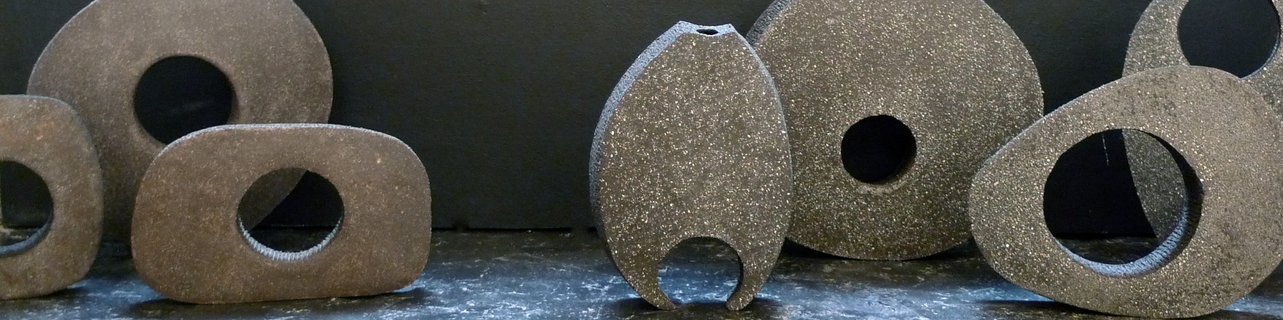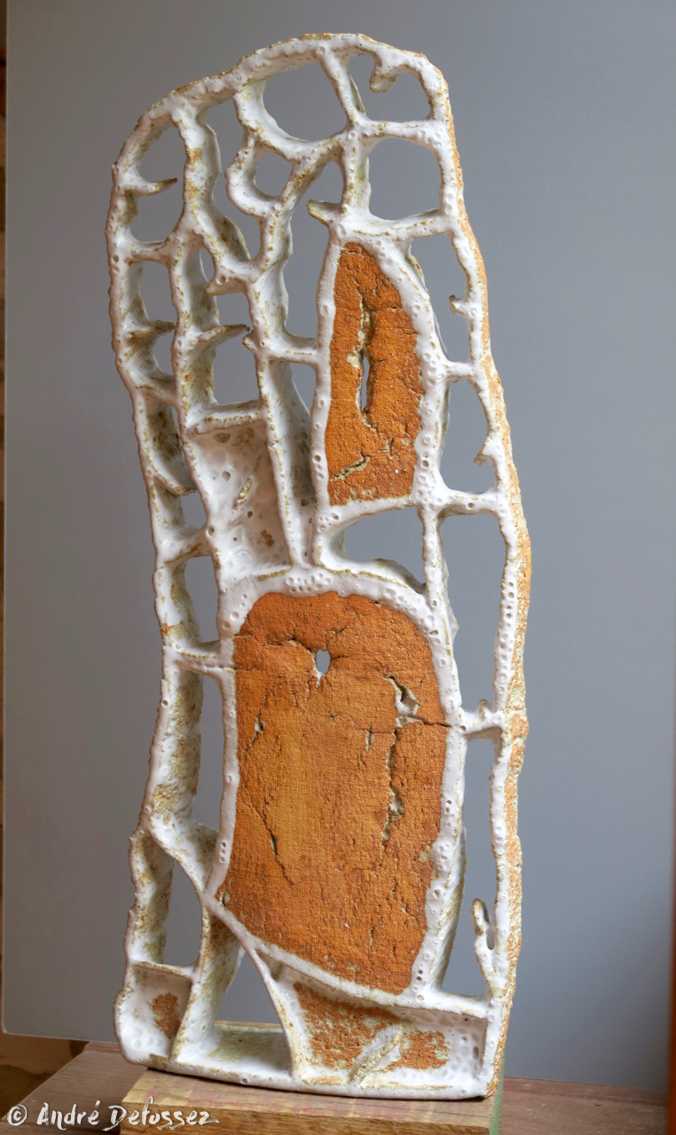 Une autre série est celle que j’ai baptisée ‘menhirs écorchés‘, car pour leur élaboration, je pars d’un bloc d’argile plein et massif, dont la forme brute est ensuite écorchée par l’évidement progressif de multiples alvéoles. Le grès utilisé étant sensiblement ferrugineux, j’obtiens un effet de rouille grâce à un émail blanc qui, surtout en faible épaisseur comme sur les bords extérieurs, révèle l’oxyde de fer présent dans l’argile. Une exception cependant : le menhir le plus sombre sort d’une cuisson anagama chez Michel Cohen; ici pas d’émaillage intentionnel, seulement le dépôt de cendres au gré des caprices du feu.