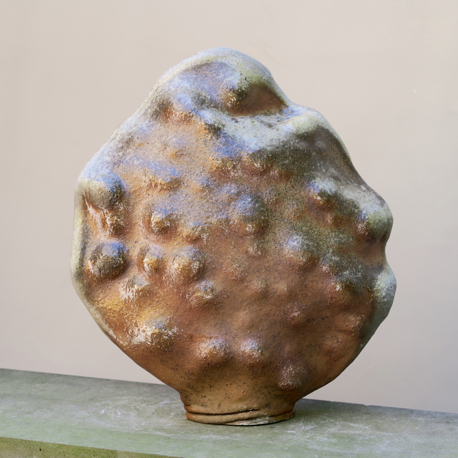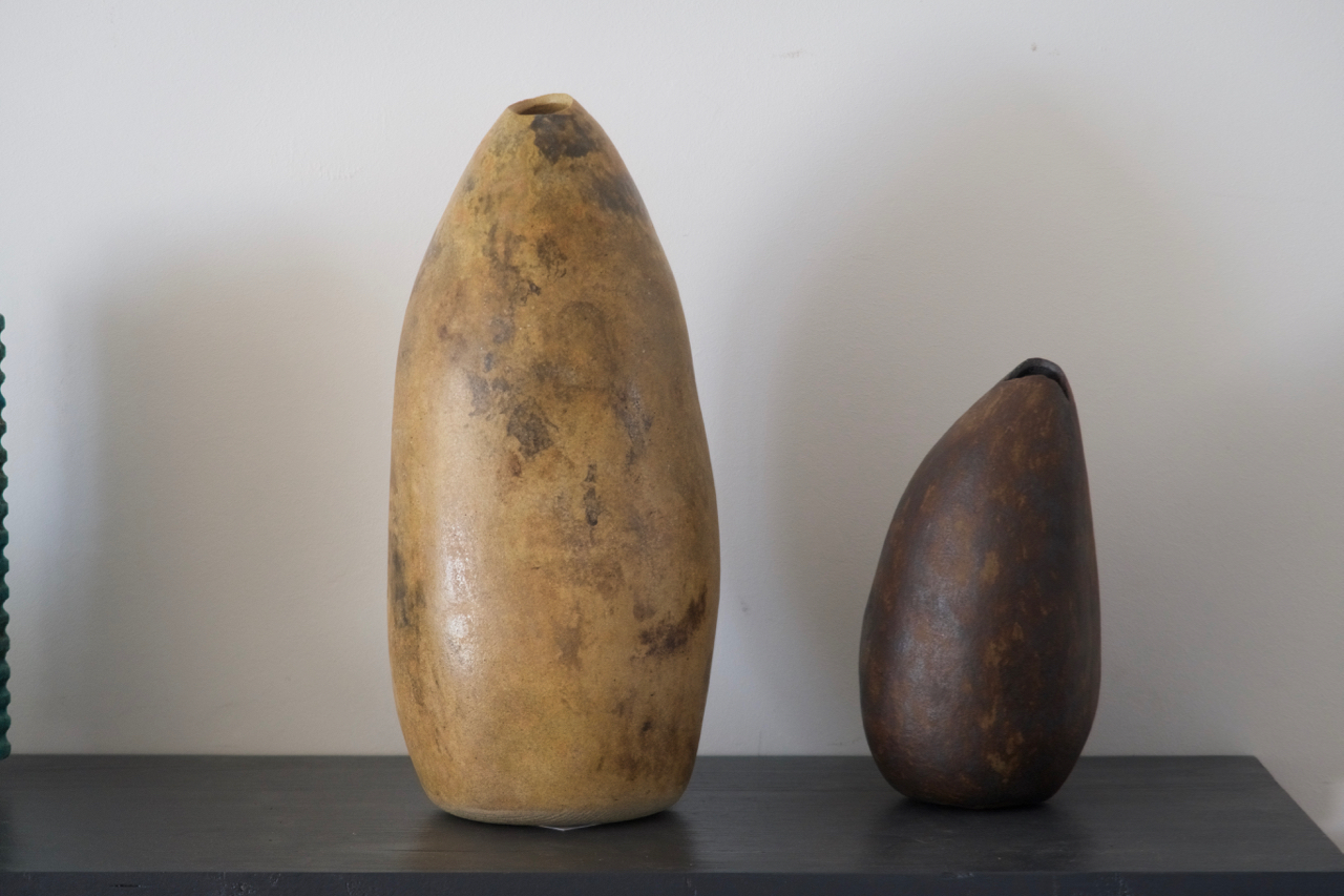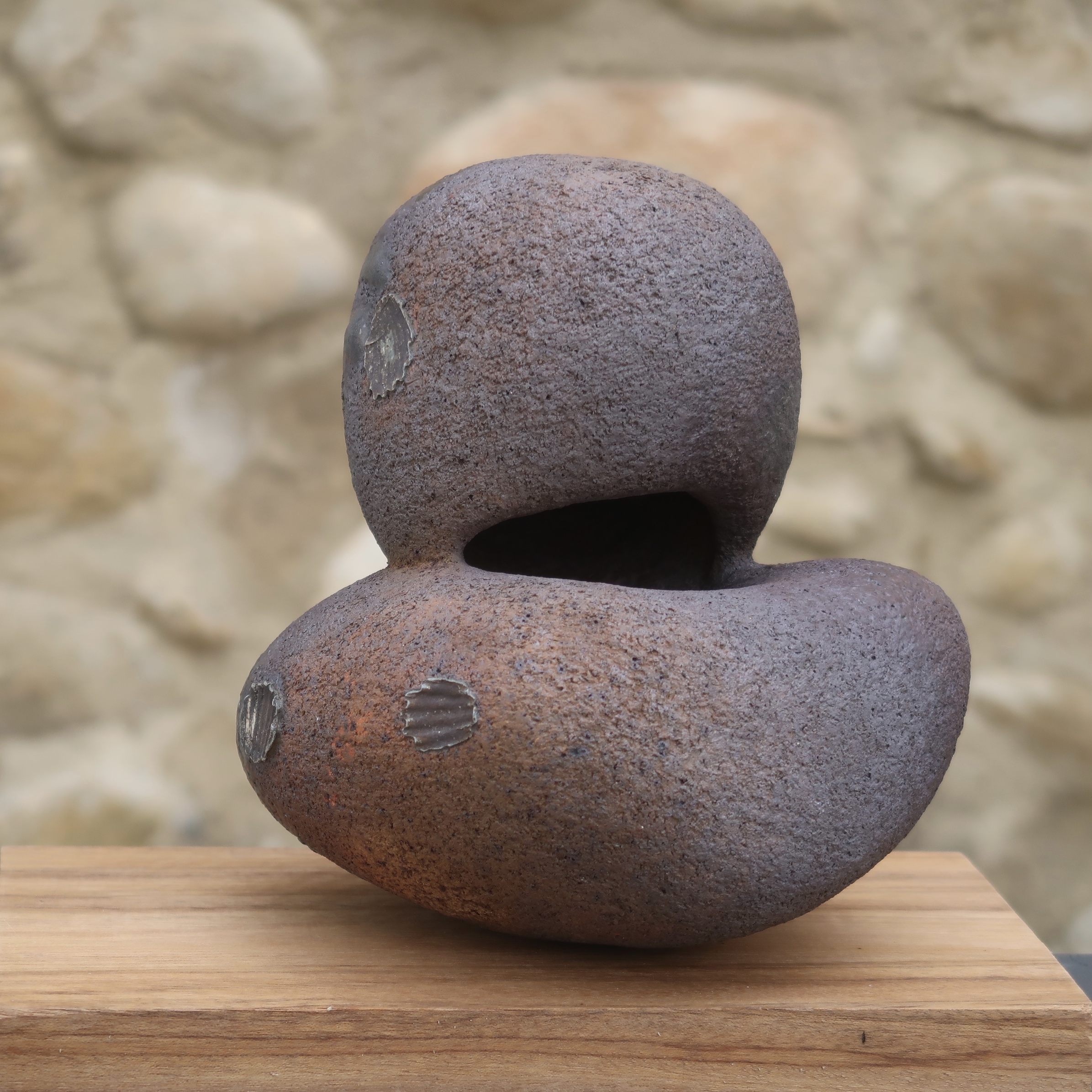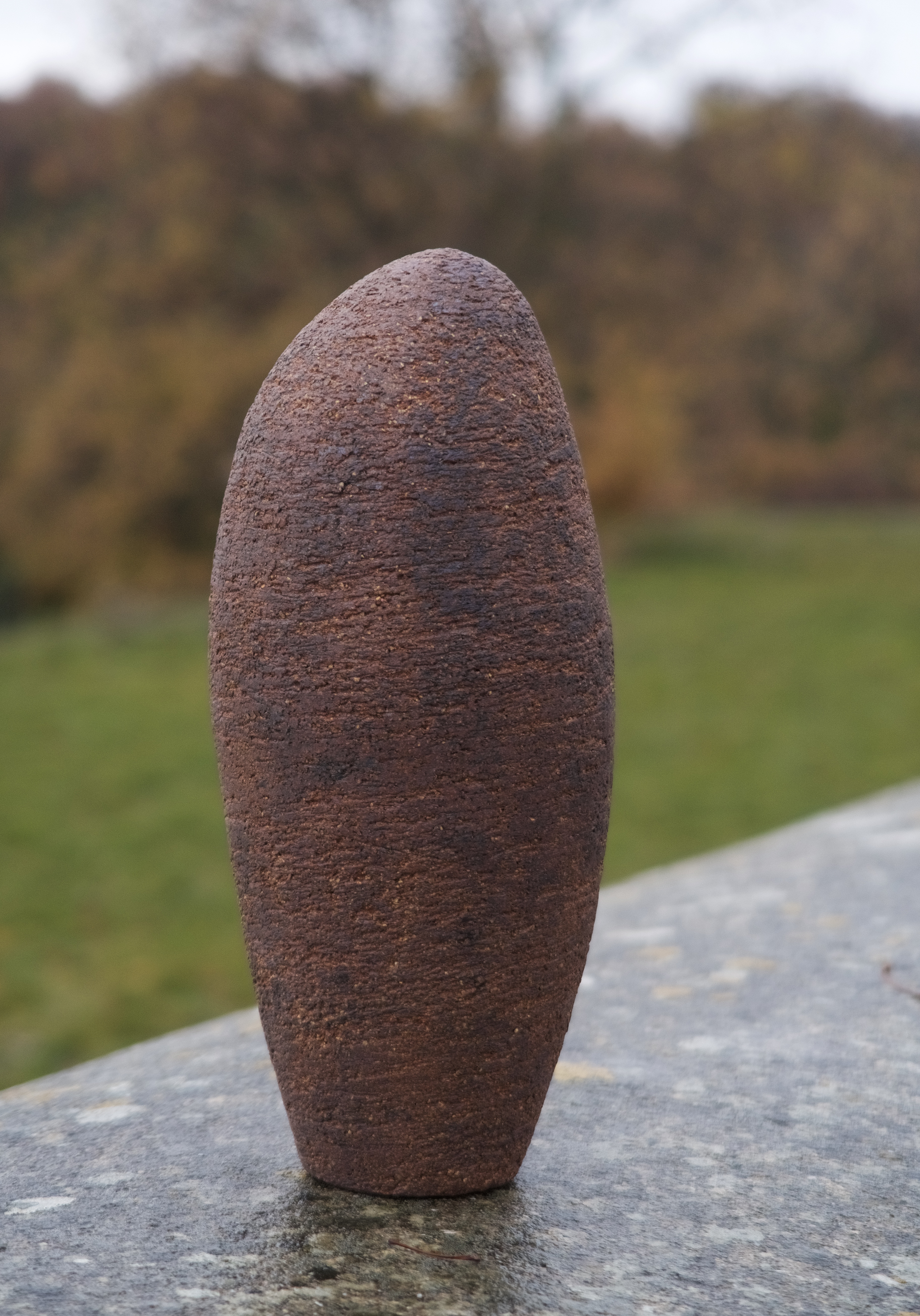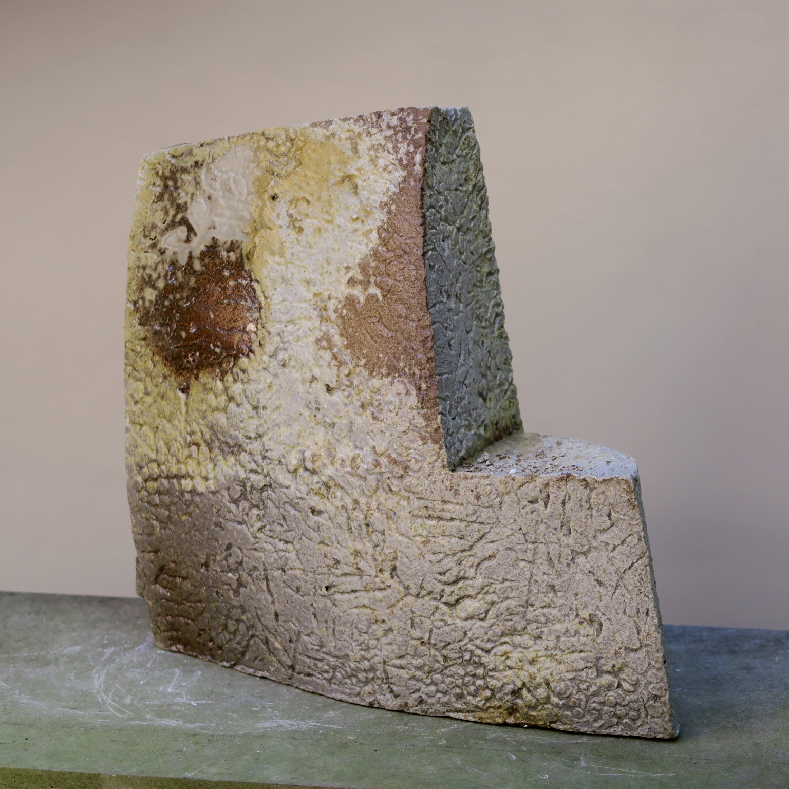 Une autre série est celle que j’ai baptisée ‘menhirs écorchés‘, car pour leur élaboration, je pars d’un bloc d’argile plein et massif, dont la forme brute est ensuite écorchée par l’évidement progressif de multiples alvéoles. Le grès utilisé étant sensiblement ferrugineux, j’obtiens un effet de rouille grâce à un émail blanc qui, surtout en faible épaisseur comme sur les bords extérieurs, révèle l’oxyde de fer présent dans l’argile. Une exception cependant : le menhir le plus sombre sort d’une cuisson anagama chez Michel Cohen; ici pas d’émaillage intentionnel, seulement le dépôt de cendres au gré des caprices du feu.